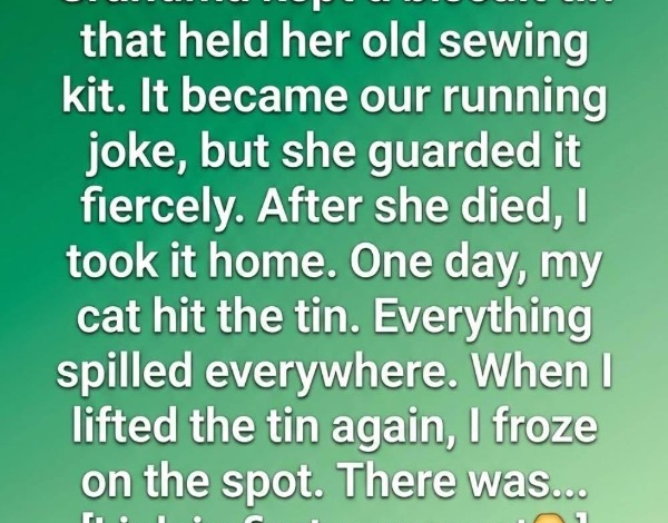 Weeks later, while cleaning, my cat jumped onto the shelf and knocked the tin to the floor. The lid popped off, scattering buttons and spools of thread across the room. As I knelt to gather the mess, something caught my eye.