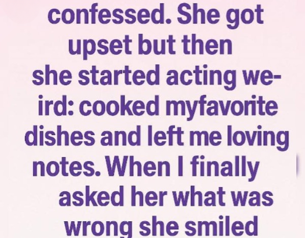 In the days that followed, she cooked my favorite meals, left small notes around the house with words like “still” and “always,” and looked at me with a kindness I didn’t feel I deserved.