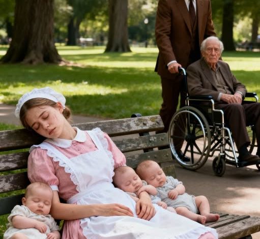 Near the old fountain, Caleb noticed a wrinkled lavender uniform draped across a bench. Recognition hit him hard. It was Olivia—the woman who had cleaned his penthouse every week for three years. Reliable, quiet, always invisible in his busy life. But today she wasn’t holding cleaning supplies. She was holding three babies, bundled tightly together, her head resting against the bench, exhaustion written across her face.