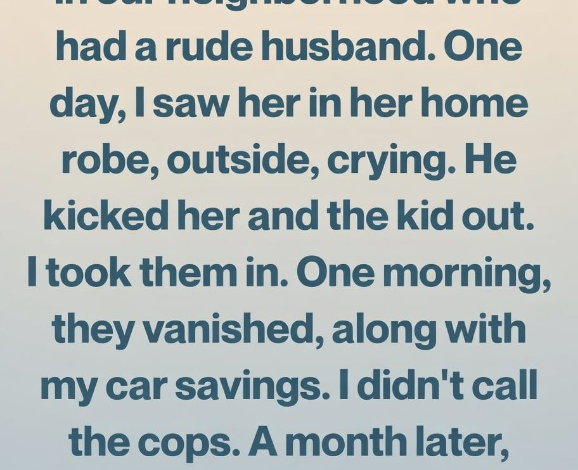 Then, on the eighth morning, they were gone. No note, no goodbye. Only silence. And my envelope of car savings—years of careful money—was missing. My chest tightened. The betrayal stung, not just for the money, but for trusting someone in need. I didn’t call the police. I wanted to believe I hadn’t misjudged her.