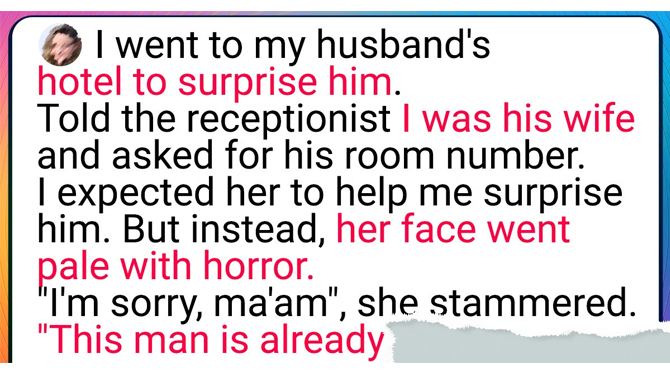 But instead of the warm reception I anticipated, the receptionist’s face went pale with horror. “I… I’m sorry, ma’am,” she stammered, looking uncomfortable. “But this man is already checked in with his wife.” I froze. “I am his wife,” I said firmly, my voice trembling.