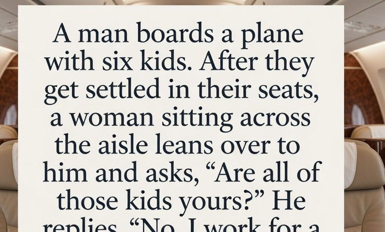 A man boards a plane with six kids, each holding onto him like they’re connected by invisible strings. A flight attendant asks, “Are they all yours?” He responds jokingly, “No, I work for a condom company. These are customer complaints!” The kids immediately start singing “Baby Shark,” causing chaos as they head to their seats. With kids causing minor havoc, the man laughs off the situation and mutters, “Maybe I should’ve just taken a car.” The kids’ antics make the flight a mix of fun and frustration, including one telling a lady about the airplane’s engines and another drawing a giraffe flying the plane.