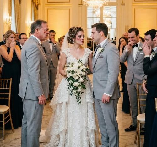 My father arrived ten minutes before the ceremony, straight from a delayed flight from Chicago. Still wearing his dark overcoat, he stepped into the bridal suite hallway and saw me. He stopped so abruptly that his shoe scraped sharply across the marble floor.