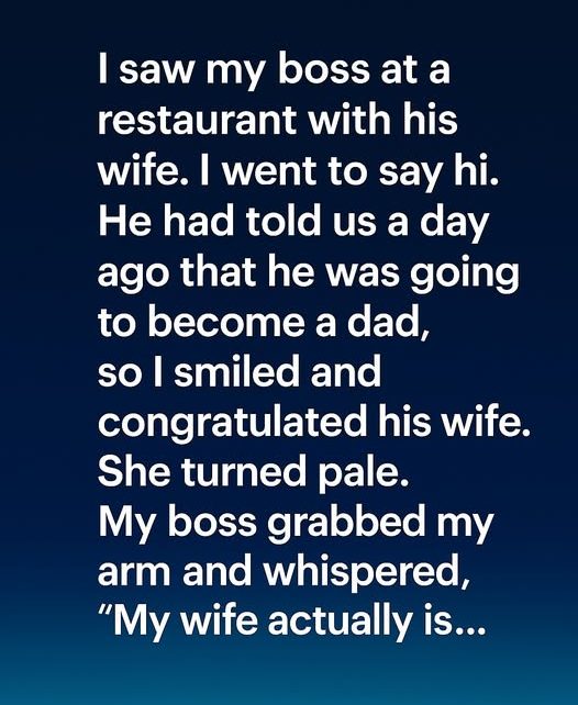 “I saw my boss at a restaurant with his wife. I went to say hi. He had told us a day ago that he was going to become a dad, so I smiled and congratulated his wife.” She froze at my words, her face draining of color. The clatter of cutlery and murmurs of surrounding diners suddenly receded into silence in my ears.