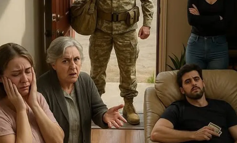 My husband stood in full uniform, duffel on his shoulder, cap tucked under one arm. For one breathtaking heartbeat, his face was pure joy—he’d come home early to surprise me. Then his gaze swept the room: his mother’s raised hand, Monica’s curled lip, Brett’s fist full of cash. The joy burned away.