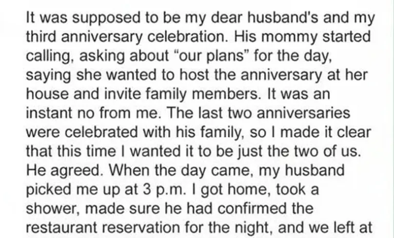 Eric chose therapy and slowly began setting boundaries with his mother. Over time, he stopped dismissing Grace’s needs and started rebuilding her trust. Six months later, they took a trip—just the two of them, without interference or guilt. For Grace, it wasn’t just about an anniversary anymore. It was about being loved by someone who finally chose her too.