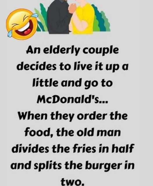 An elderly couple decides to live it up a little and go to McDonald’s… When they order the food, the old man divides the fries in half and splits the burger in two.