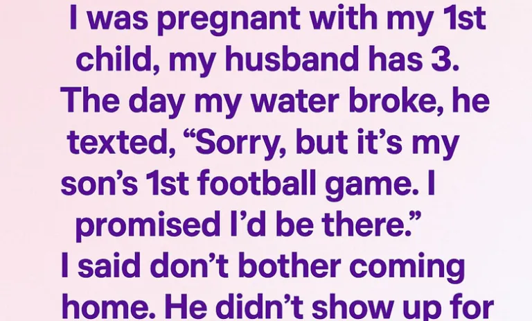 I was pregnant with my 1st child, my husband has 3. The day my water broke, he texted, “Sorry, but it’s my son’s 1st football game. I promised I’d be there.” I said don’t bother coming home. He didn’t show up for 3 days. Worried, I went to his ex’s house, she looked flustered. I…