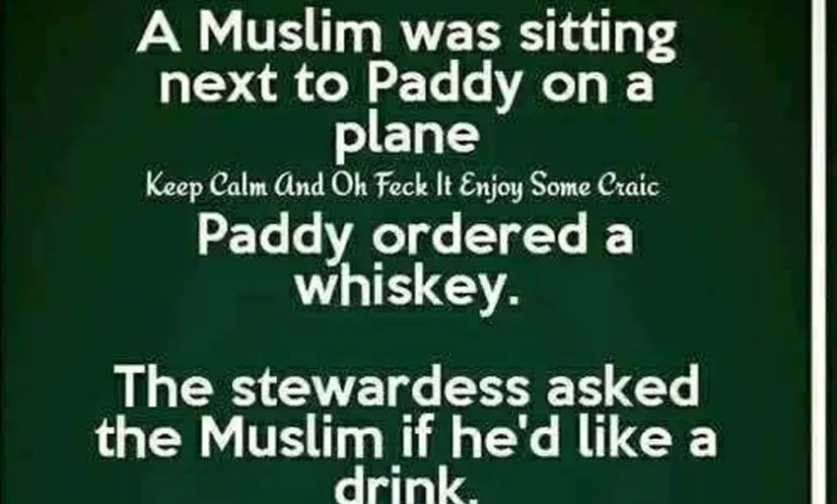 Post Views: 246 A Muslim was sitting next to Paddy on a plane. Keep Calm And Oh Feck It Enjoy Some Craic Paddy ordered a whiskey. The stewardess asked the Muslim if he’d like a drink. He replied in disgust, “I’d rather be raped by a dozen whores than let liquor touch my lips!” Paddy […]
