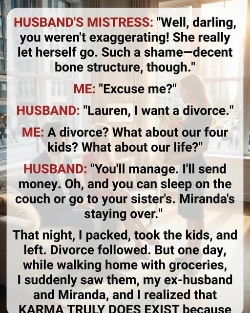 Post Views: 54 ME: “A divorce? What about our four kids? What about our life?” HUSBAND: “You’ll manage. I’ll send money. Oh, and you can sleep on the couch or go to your sister’s. Miranda’s staying over.”That night, I packed what I could, gathered the kids, and walked out of the house I had built […]